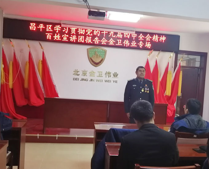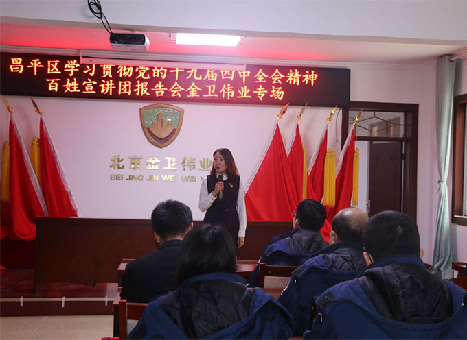 2019年12月24日。北京金卫伟业保安服务有限公司工会邀请昌平区百姓宣讲团,为公司机关职工、优秀保安员代表,举办学习贯彻党的十九大四中全会精神专场报告会。