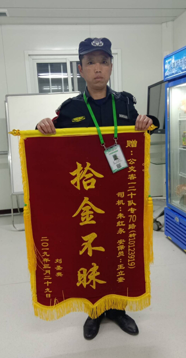 2019年3月29号,北京金卫伟业保安服务公司驻公交专70线路乘务管理员王立奎,像往常一样在公交车上执勤。中午11点30分左右,他执勤的专70路公交车行使到沙河北大桥站,王立奎从车前方往车的后方巡视,当他巡视到车的后排时,发现一个座位上,遗留手提包一个,前后排上也没有乘客。出于职业的敏感,他立即打开包,一看里面全部是现金。他意识到丢包的人一定非常着急,便大声呼喊“这是谁丢的包?”同时,一双眼睛迅速寻找丢包的人,遗憾的是丢包的乘客已经下车离开了。乘务管理员王立奎与司机朱红永交流后决定回场站汇报值班领导,并及时将包上缴调度室。场站领导发动70路专线的所有乘务管理员,帮助寻找失主。下午失主刘女士来到专70路场站,说明来意,场站领导根据其提供的证据,确认她就是丢失现金的人。原来,失主患上了一种疑难病,家里经济不宽裕,这13800元是失主借来看病用的“救命钱”。当她看到丢失的13800元的现金失而复得时,高兴的不知道说什么好,激动的说,“你们是好人,你们就是活雷锋啊!”为表示感谢,她拿出200元钱,一定要感谢北京金卫伟业保安公司保安乘务管理员王立奎,但被王立奎婉言谢绝了。王立奎告诉失主,“这是我们保安乘务管理员应该做的”。失主不住点头:“北京保安真是好!”第二天,为表示感谢,失主特意给保安王立奎、驾驶员朱红永送来旌旗。