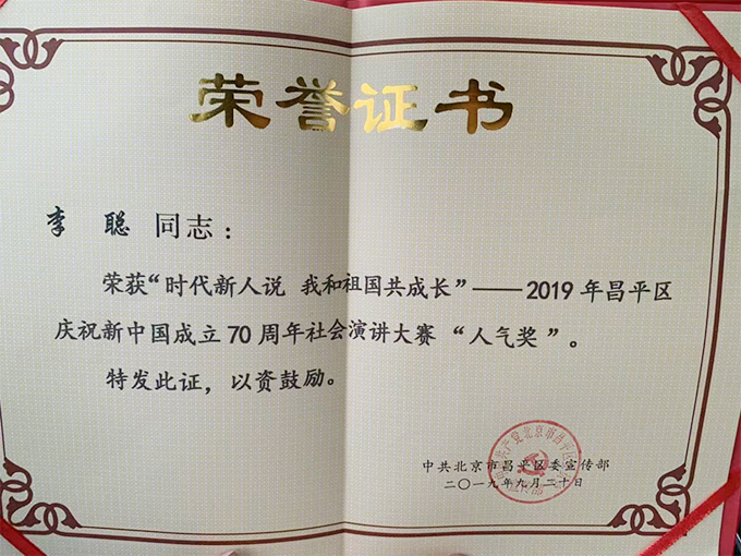 全区各个宣讲分团,分别在各乡镇重点企业宣讲,然后优秀代表去昌平区各单位宣讲,通过各个轮次宣讲,让更多的受众人群更加了解昌平的故事。最终通过宣讲员激烈角逐,北京金卫伟业保安服务公司李聪同志,荣获“时代新人说 我和祖国共成长”----2019年昌平区庆祝新中国成立70周年社会演讲大赛“人气奖”。