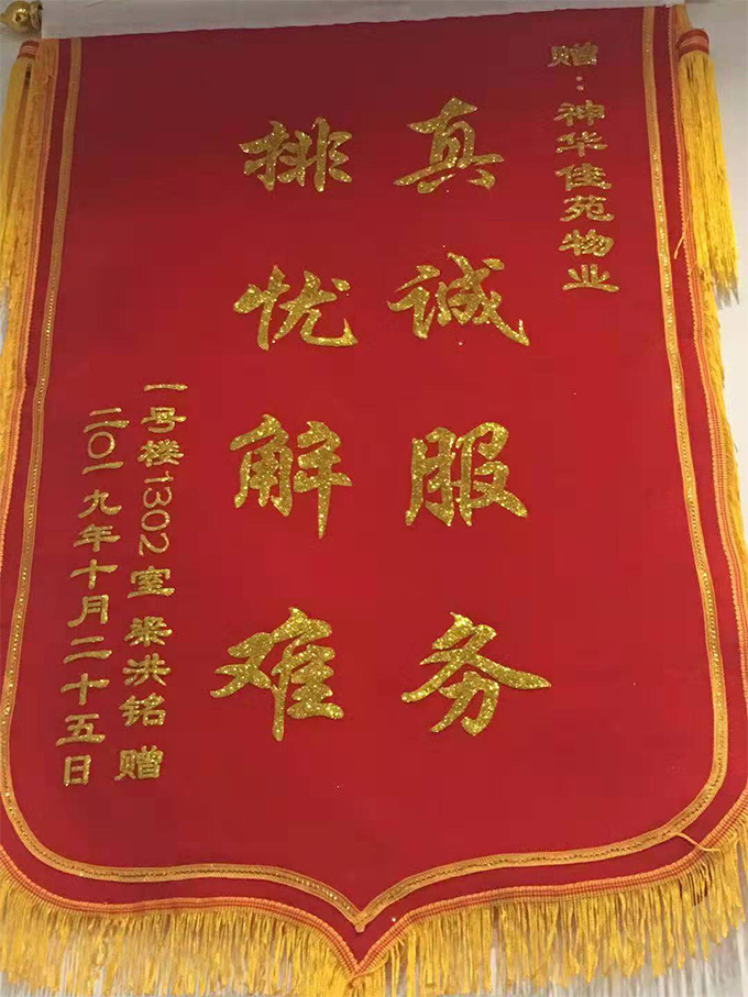 保安队长观察分析当前的情况,对比轮椅和楼道的宽度,决定把老人抬至13楼。经过大家的共同努力,老人终于回到了13楼的家里,业主家属为表感谢,特送锦旗一面。