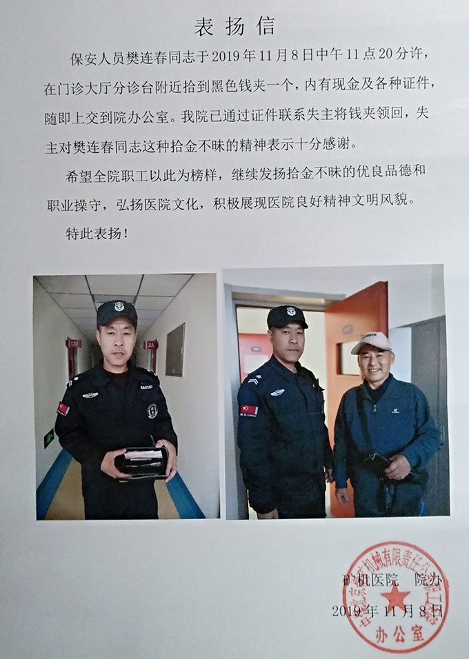金卫伟业保安员获矿机医院表扬信