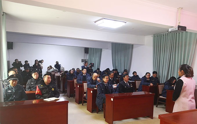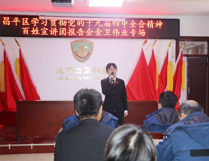 2019年12月24日。北京金卫伟业保安服务有限公司工会邀请昌平区百姓宣讲团,为公司机关职工、优秀保安员代表,举办学习贯彻党的十九大四中全会精神专场报告会。