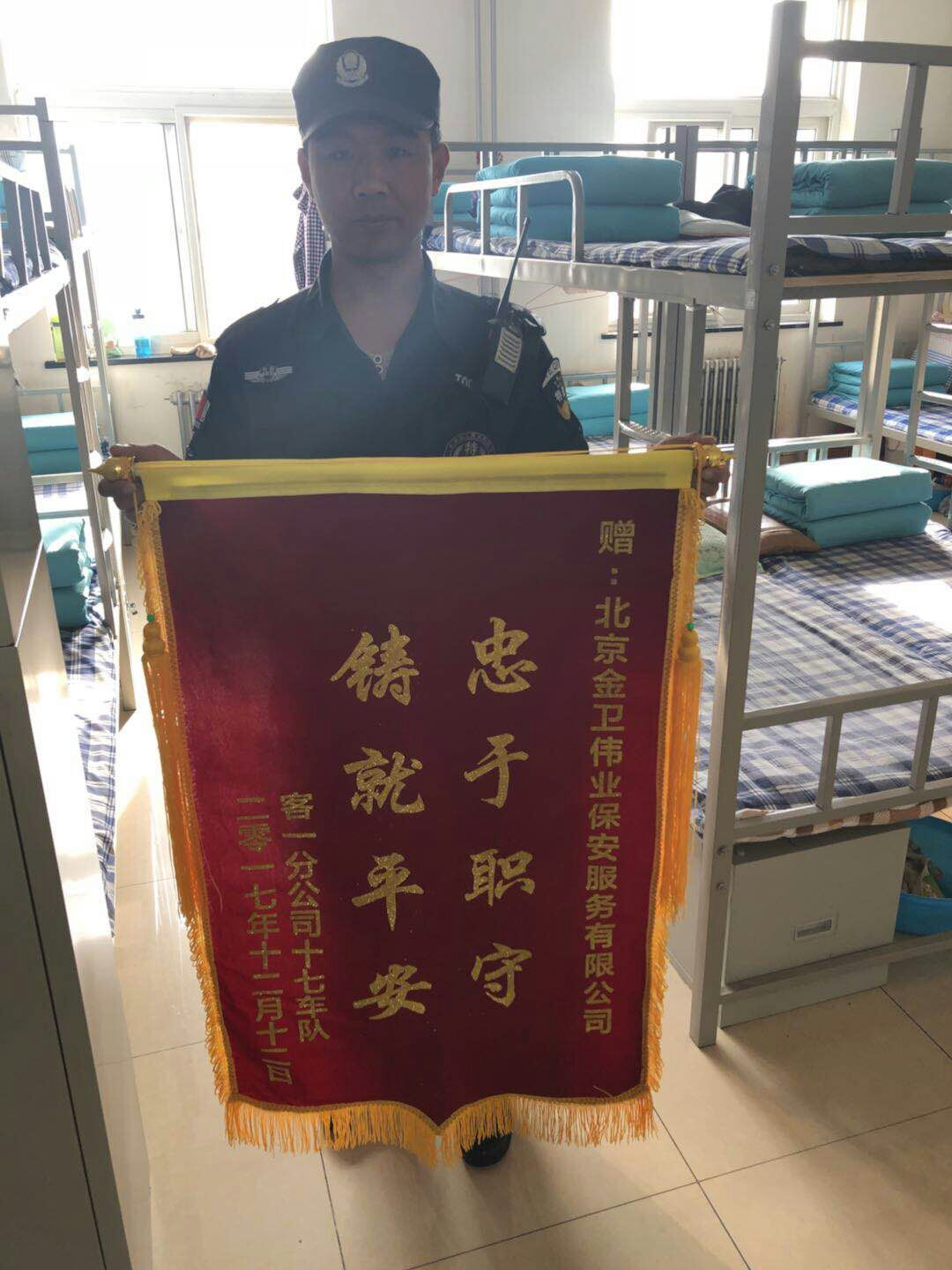 2017年12月8日,北京公交集团客一分公司十七车队给北京金卫伟业保安服务有限公司送来锦旗、锦旗上“忠于职守、铸就平安”八个大字熠熠生辉,它是对北京金卫伟业保安服务有限公司公交项目管理工作的肯定、是对金卫伟业保安公司严格执勤的褒奖;2017年12月8日;公司公交事业部吴玉军总监收到了北京公交集团客一分公司的一个通知,通知显示,2017年11月份,北京公交集团客一分公司对近40家从事公交项目安全管理的保安公司进行了综合管理成绩排名,北京金卫伟业保安公司位列第三名;2017年11月份,公交公司第三方检查报告显示,北京金卫伟业公交安全管理未发生任何管理问题、、、、、、 公交事业部一个又一个的喜讯接踵而至,一个又一个拾金不昧、助人为乐的好人好事层出不穷,这一件件、一桩桩是对北京金卫伟业保安公司公交事业部全体人员持之以恒付出的回报。金卫伟业公交事业部这个年轻的部门,为我们公司竖起了一面旗帜,这面旗帜,是公司规范化、精细化、标准化管理的典范,是北京金卫伟业保安公司集体智慧和公交事业部全体人员辛勤汗水的凝聚!