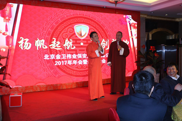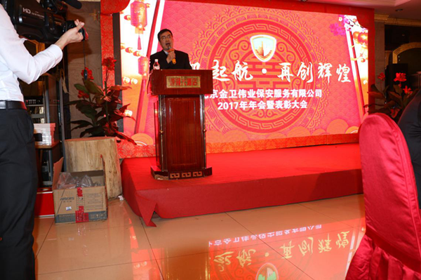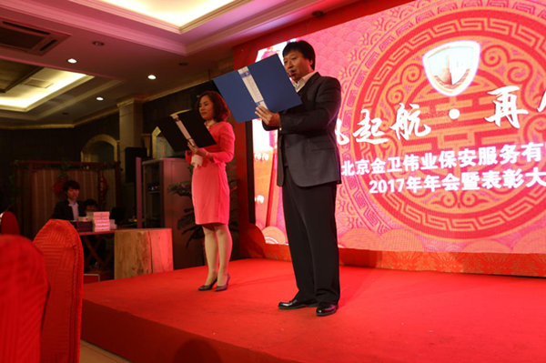 2018年2月4日,春天的脚步悄然地来到了我们身边,北京后花园的昌平区风和日丽,后花园里,煌朝大酒店宴会大厅布置一新,一派喜气洋洋的气氛。北京金卫伟业保安服务有限公司2017年总结表彰大会(年会)在这里隆重举行,来自公司各个部门及分公司200多名干部职工代表,济济一堂,恭祝公司2017年取得的辉煌成就,共商2018年公司发展的大计。喜庆的年会,奏响了金卫伟业2018年腾飞的乐章!