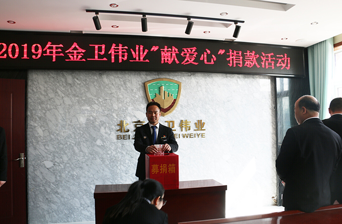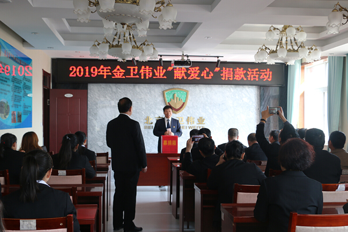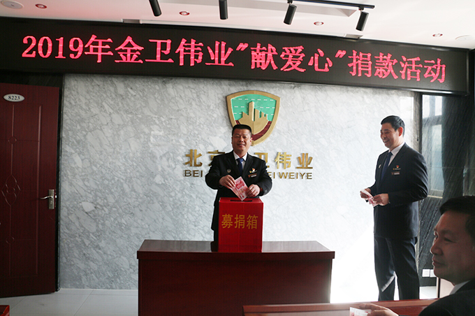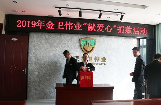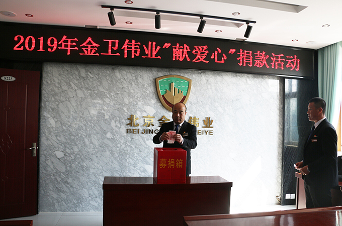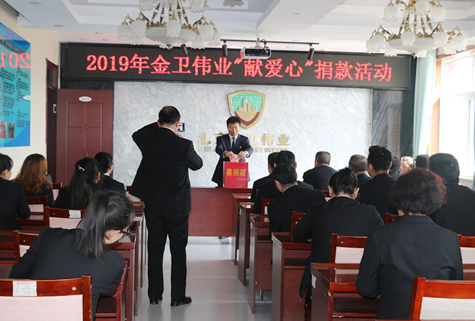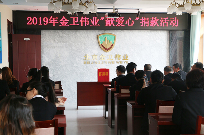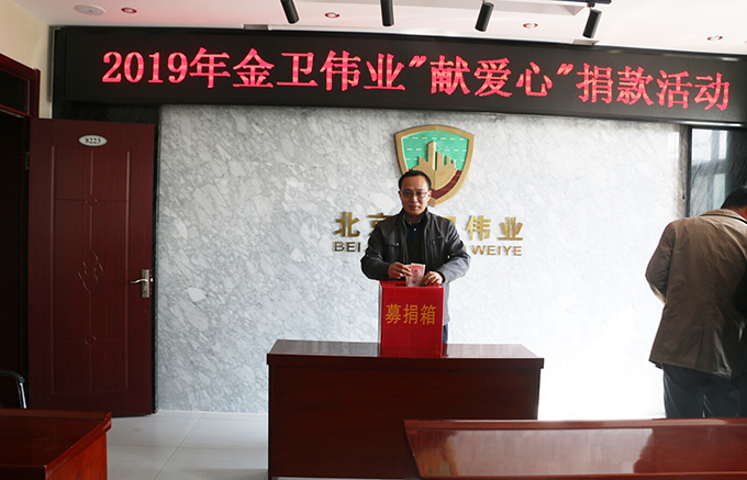 2019年4月16日,公司发起了“2019年金卫伟业献爱心捐款活动”。为帮助十三陵北新村小学五年级张海涛家庭捐款,帮助他渡过难关。张海涛父亲前年去世,姐姐和母亲又同时患有精神疾病。北京金卫伟业保安公司工会得知消息后,向全体机关员工发出了倡议:伸出双手,奉献爱心,以捐款方式向张海涛家庭提供关怀和帮助。